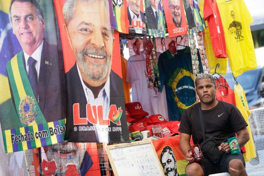 Barraca na Zona Sul do Rio com artigos para eleitores de Bolsonaro e Lula nas eleições de 2022 — Foto: Roberto Moreyra/Agência O Globo