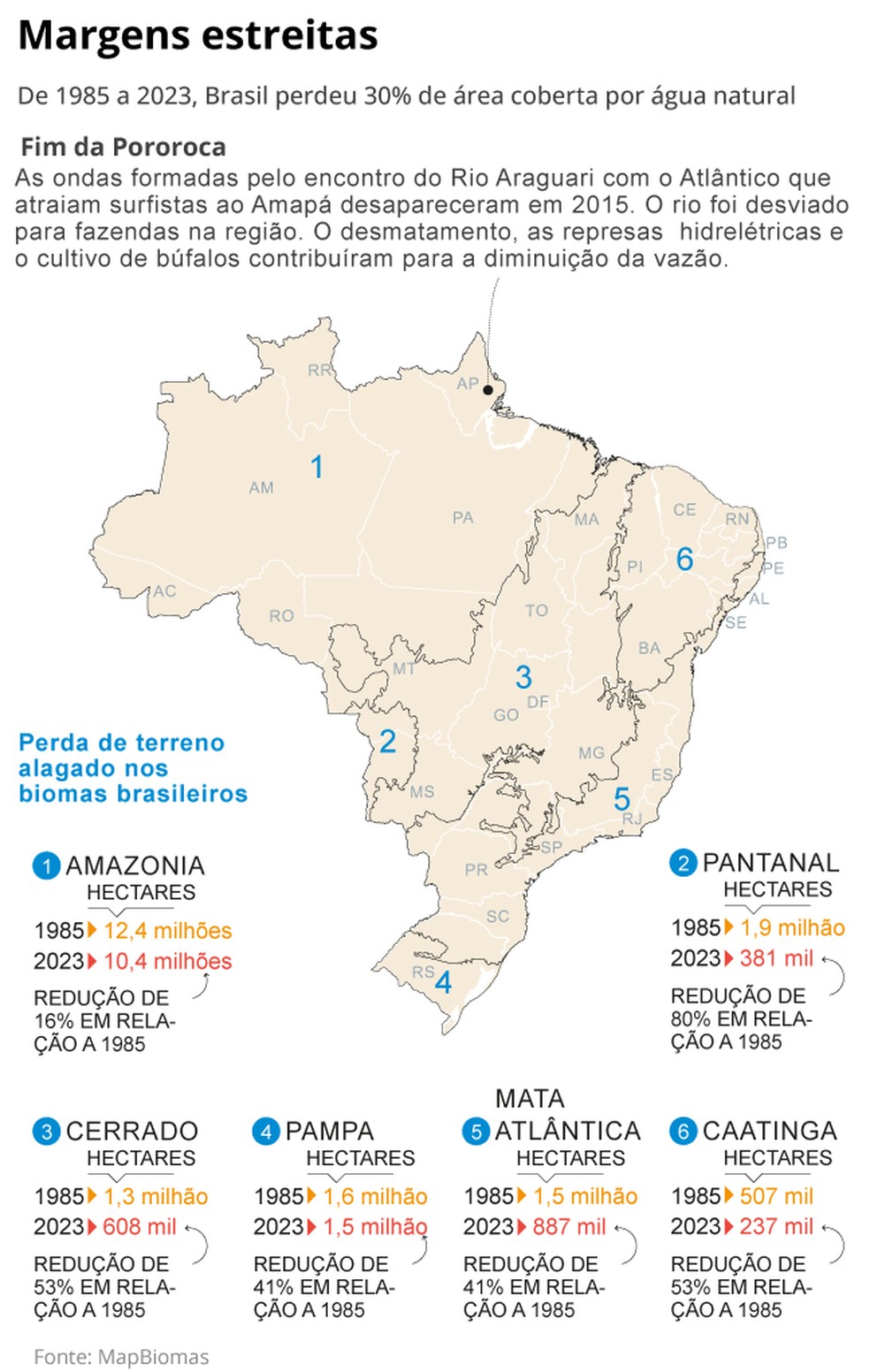 O MapBiomas Água mostra que a área de superfície alagada do país foi,no ano passado,1,5% menor que a média histórica. Em biomas como Cerrado e Caatinga,os reservatórios artificiais — hidrelétricas e lagos de mineração — já são maiores que os corpos hídricos naturais,como rios e lagoas.