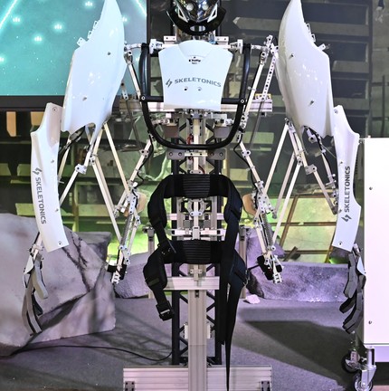 'Skeletonics',um traje produzido pelo fabricante japonês de robôs Robot Ride,em exibição na zona de emergência e mobilidade do 'Japan Mobility Show' em Tóquio — Foto: KAZUHIRO NOGI / AFP