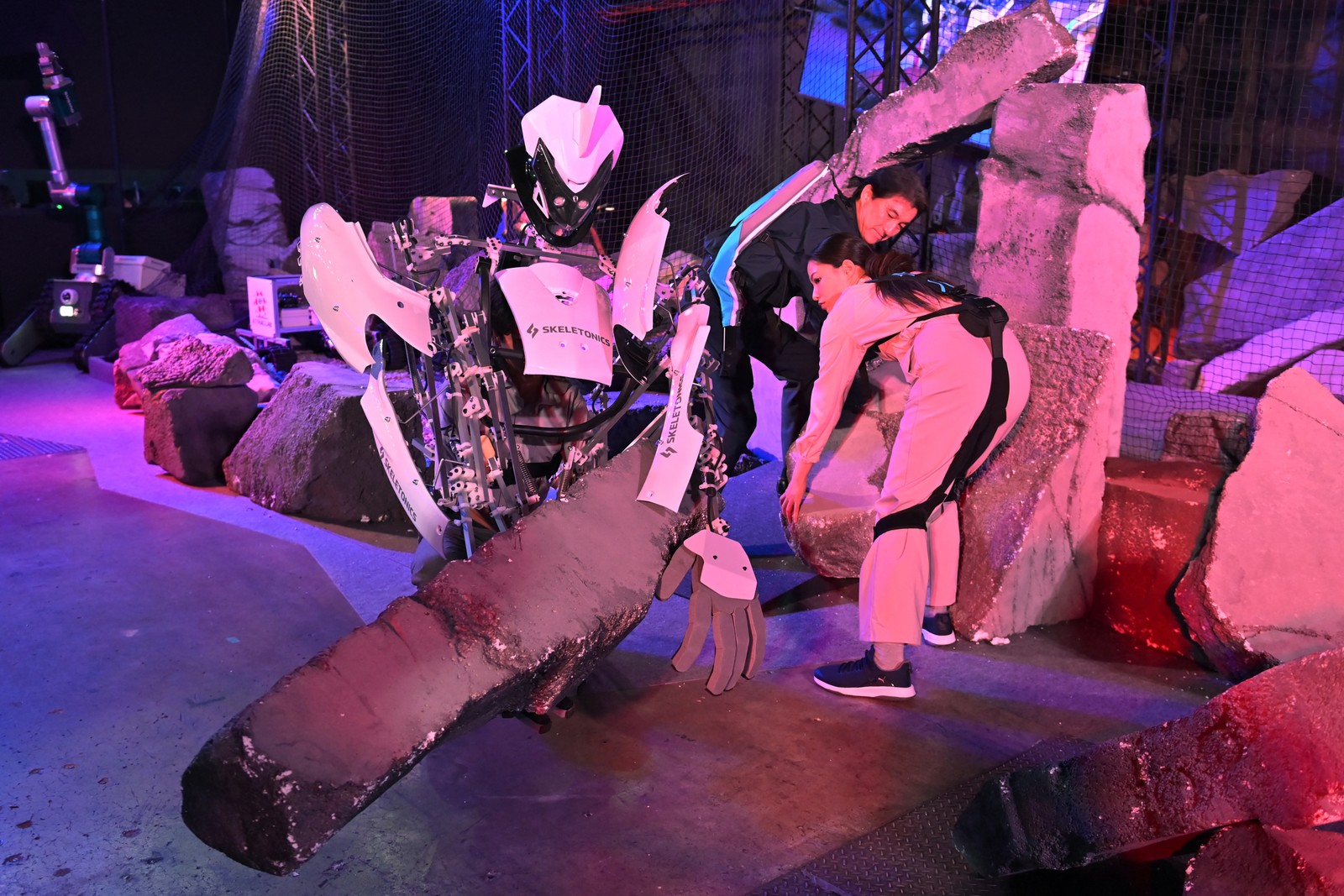 Um homem veste o 'Skeletonics',e move obstáculos durante uma demonstração no Japan Mobility Show em Tóquio — Foto: KAZUHIRO NOGI / AFP