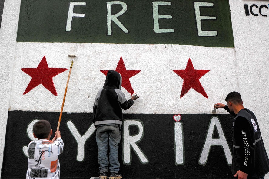 Homem e crianças pintam mural representando a bandeira síria da época da independência com o slogan 'Síria livre' em Homs — Foto: AAREF WATAD / AFP