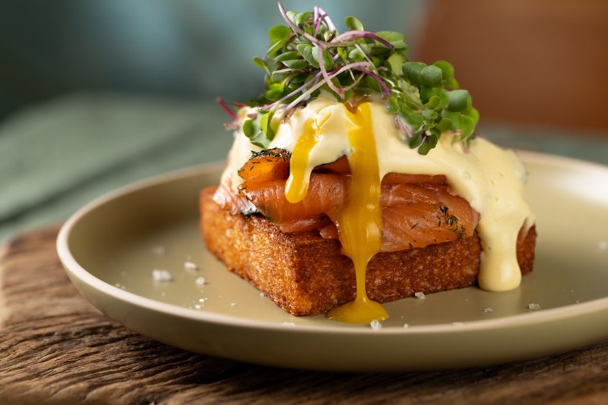 Beneditino de salmão gravlax com molho hollandaise do Guimas Bar & Brunch — Foto: Rodrigo Azevedo