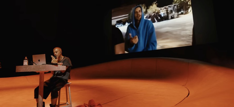 Bieber estava sentado em um banquinho com um laptop,navegando por vídeos de suas músicas no YouTube e reproduzindo suas músicas antigas como parte de um breve medley de 12 canções.