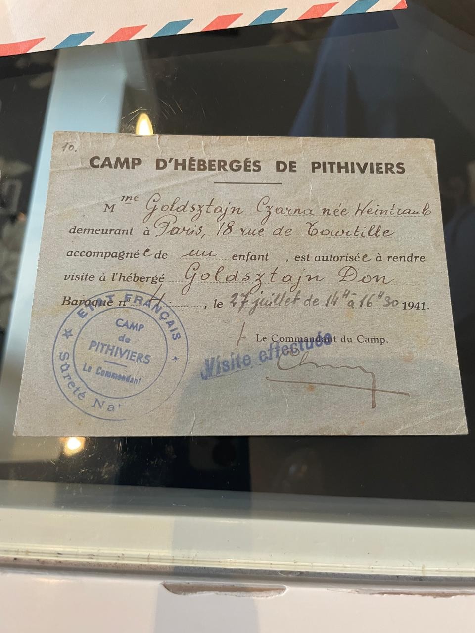 "Comprovante" de visita de Charlotte e sua mãe,que comprovava a ida delas para visitar o pai,que estava em Pithiviers. — Foto: Arquivo pessoal