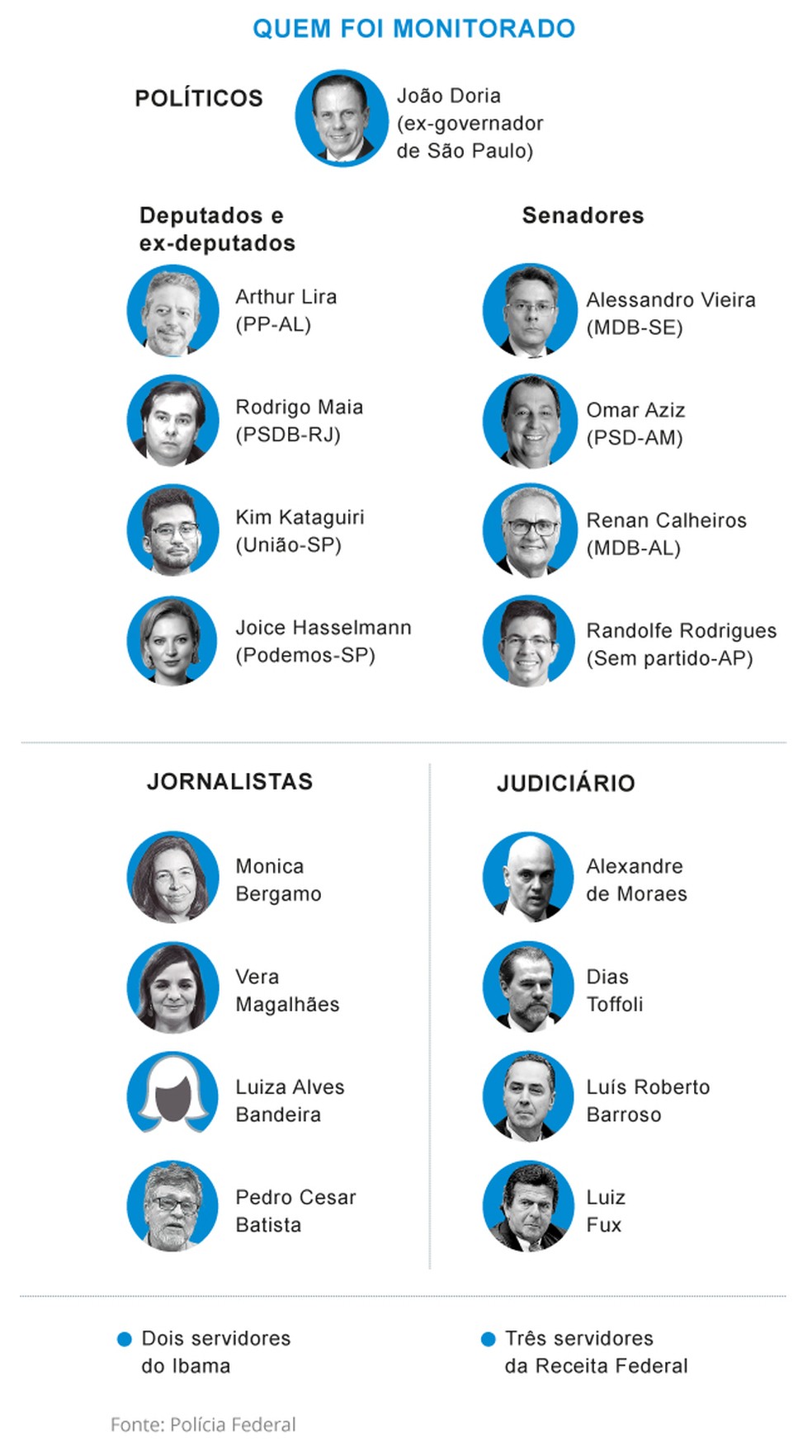 No STF,foram monitorados os ministros Alexandre de Moraes,Dias Toffoli,Luís Roberto Barroso e Luiz Fux. No Legislativo,os alvos incluem o atual presidente da Câmara,Arthur Lira (PP-AL),o ex-presidente Rodrigo Maia e quatros senadores que integraram a CPI da Covid: Alessandro Vieira (MDB-SE),Omar Aziz (PSD-AM),Randolfe Rodrigues (Sem partido-AP) e Renan Calheiros (MDB-AL).