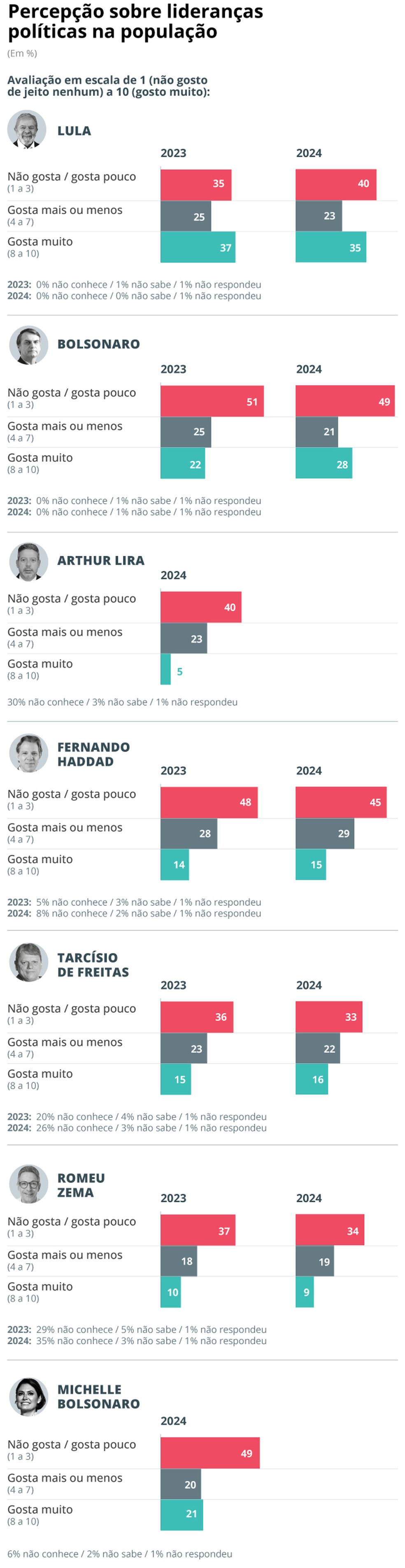 Apesar dos obstáculos na campanha municipal,Lula e Bolsonaro despontam com maior protagonismo do que outras figuras de alcance nacional. Os governadores de São Paulo,Tarcísio de Freitas (Republicanos),e de Minas,Romeu Zema (Novo),e o presidente da Câmara,Arthur Lira (PP-AL),têm taxas de desconhecimento beirando um terço dos entrevistados. Os índices dos que dizem não gostar de Tarcísio e de Zema também ficam nesse patamar,superior ao dos que gostam de cada um. No caso de Lira,a rejeição chega a 40%,a mesma de Lula.