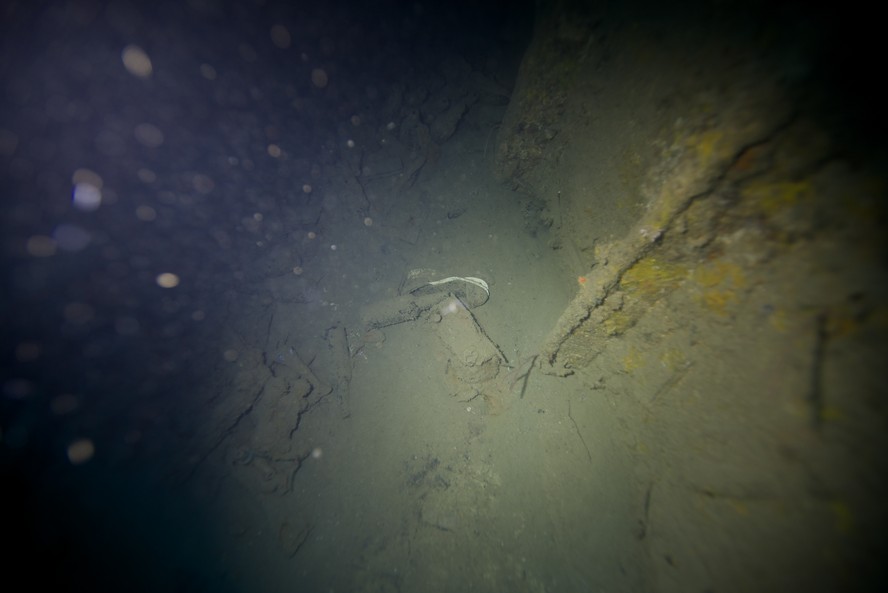 Vestígios do Vital de Oliveira encontrados no fundo do mar mostram o que parece ser um sapato de marinheiro dentro do casco — Foto: Foto: Agência O Globo