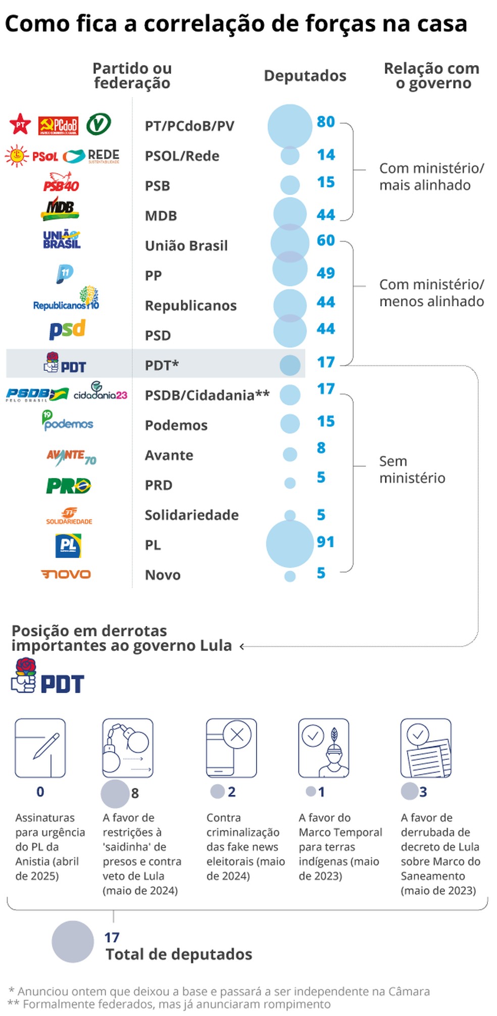 A saída do PDT da base aliada na Câmara ocorre em um momento de fragilidade na relação de Lula com o Congresso. Após queda na popularidade nos últimos meses,siglas que integram o governo iniciaram movimentos para se descolar do Palácio do Planalto e colocam em dúvida o apoio à reeleição em 2026. No mês passado,por exemplo,discordâncias no União Brasil levaram o líder da sigla na Câmara,Pedro Lucas Fernandes (MA),a rejeitar convite para assumir o Ministério das Comunicações.