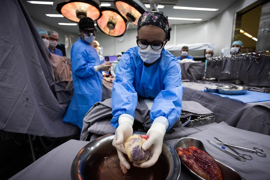 Profissional de saúde manipula coração saudável que será transplantado,ao lado do coração doente — Foto: Maria Isabel Oliveira
