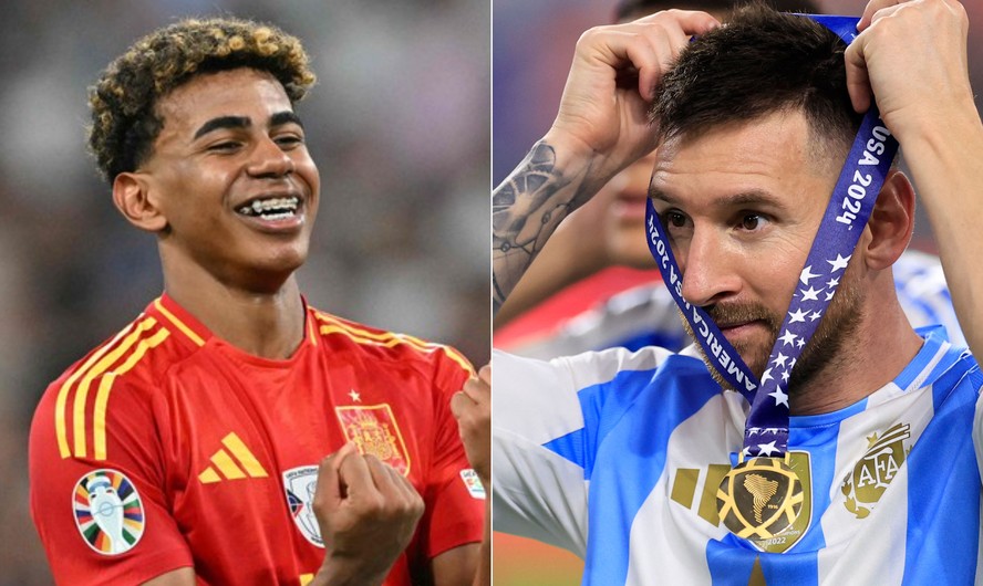 Yamal e Messi,destaques de Espanha e Argentina — Foto: Miguel Medina/AFP e Buda Mendes/AFP