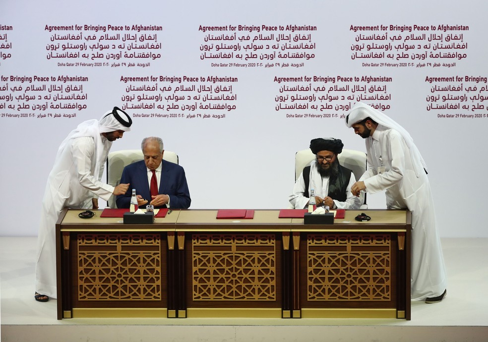 Representantes dos EUA,Zalmay Khalilzad (E),e do Talibã,Abdul Ghani Baradar,assinam acordo em Doha,em fevereiro de 2020 — Foto: KARIM JAAFAR / AFP