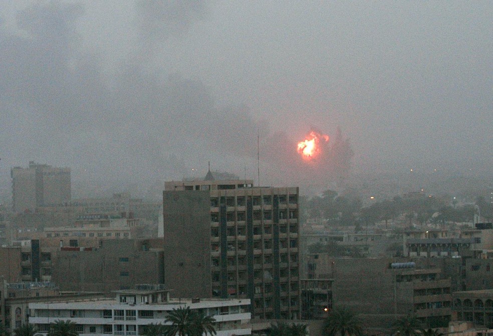Explosões provocadas por mísseis dos EUA em Bagdá,no início da Guerra do Iraque,em março de 2003 — Foto: KARIM JAAFAR / AFP