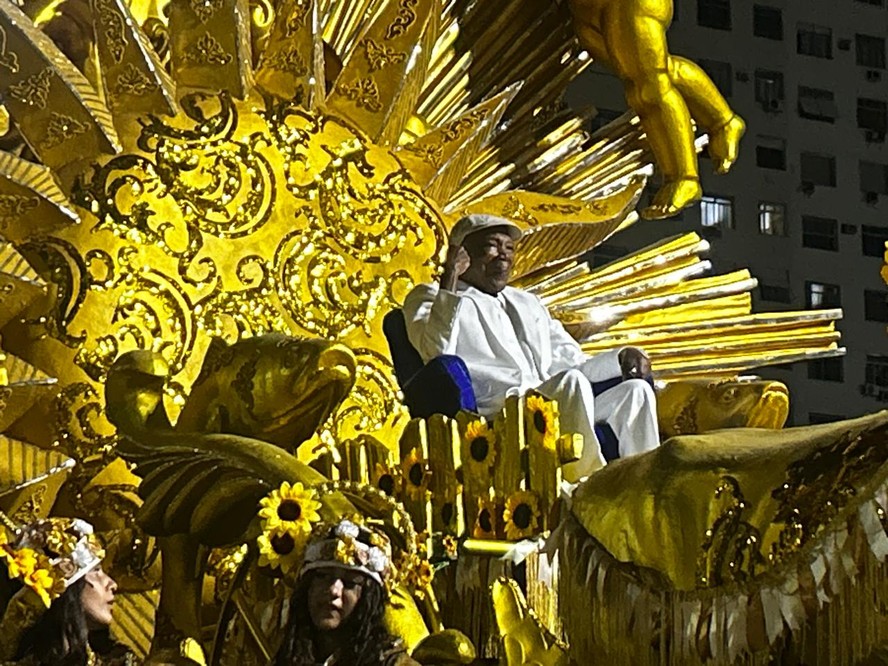 Milton Nascimento no trono do último caro da Portela — Foto: Rafaela Gama/ Agência O Globo