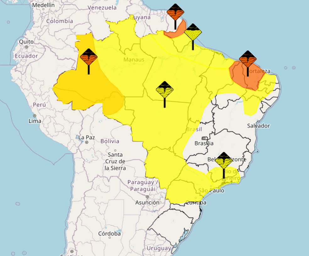 Em todo o Norte e em boa parte do Centro-Oeste,Nordeste,além de alguns estados das regiões Sul e Sudeste,o risco de chuvas intensas é apontado. Três deles,na escala laranja,de "Perigo",indicam chuvas entre 50 e 100 mm/dia e ventos intensos de até 100 km/h.
