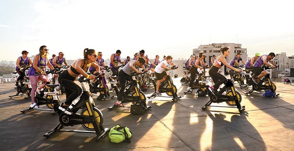 É uma aula de spinning típica: pedala-se de pé,sentado,simulando flexões ou no ritmo do funk,samba e rock dos anos 1980. A excentricidade fica por conta do local e do visual: do alto de helipontos e de terraços de prédios da capital paulista,fileiras simétricas de bicicletas por vezes bloqueiam temporariamente os pousos e decolagens de helicópteros. Com duração de cerca de 50 minutos,ingressos na casa dos R$ 200 e até fogos de artifício,as aulas de “spinning nas alturas” ganharam o topo de São Paulo.