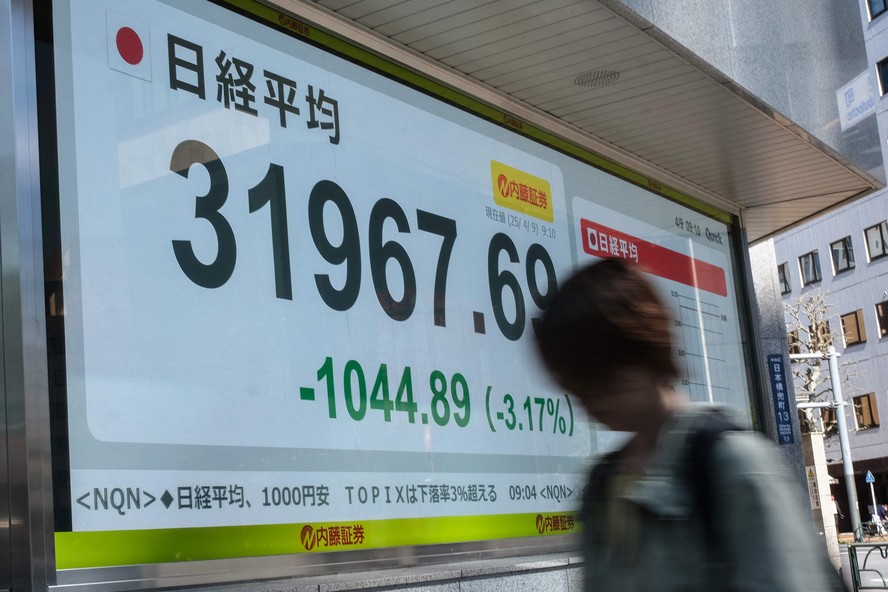 Painel mostra os números do Nikkei Stock Average,na Bolsa de Valores de Tóquio,em 9 de abril de 2025 — Foto: Kazuhiro NOGI / AFP