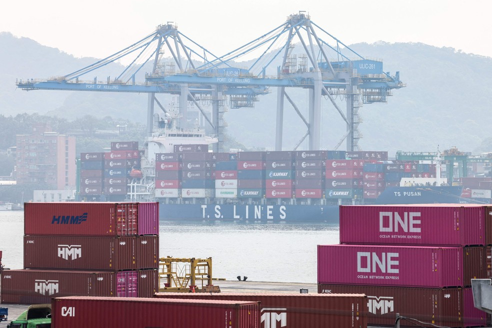 Carregamento de contêineres no porto de Keelung,em Taiwan — Foto: I-Hwa Cheng / AFP