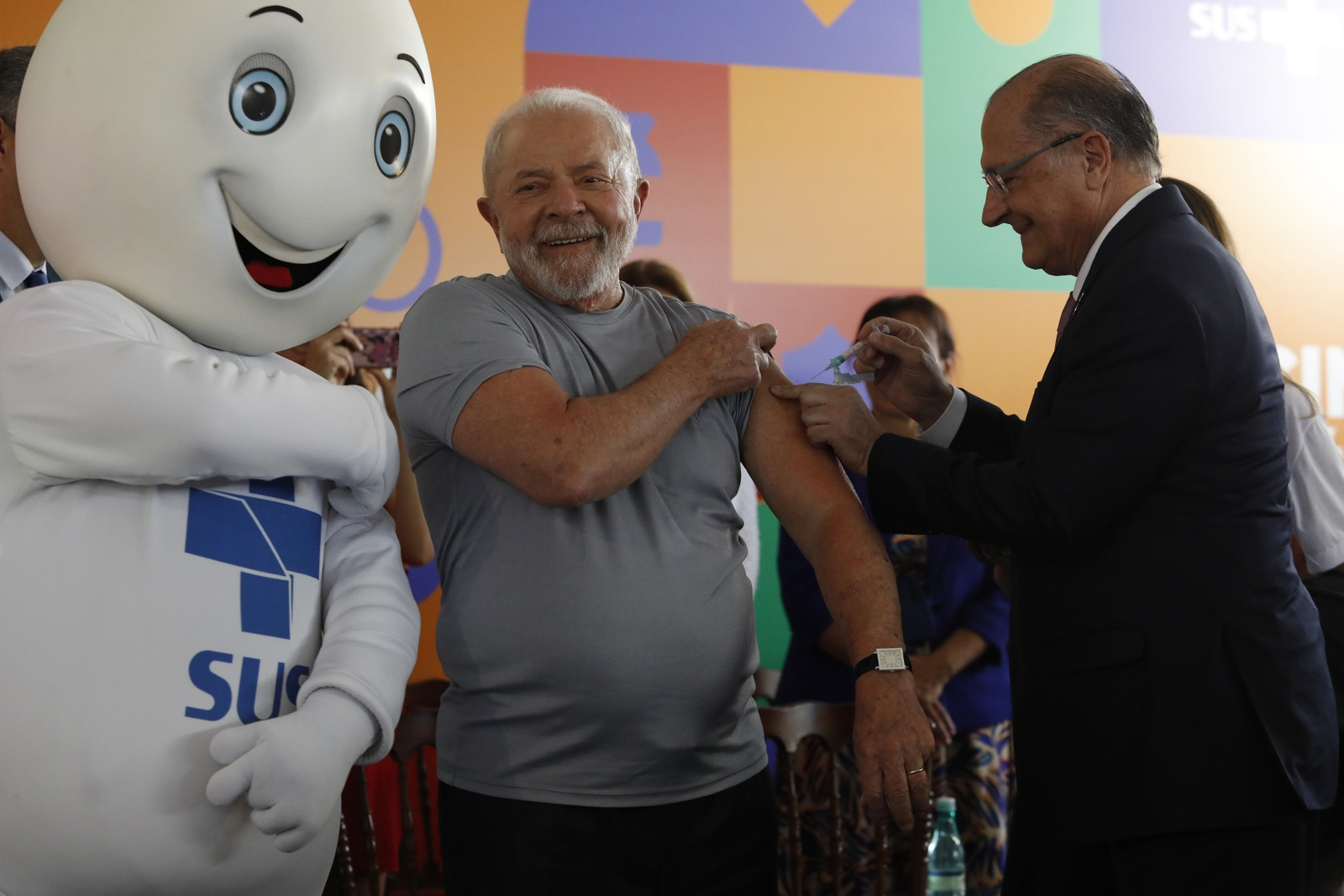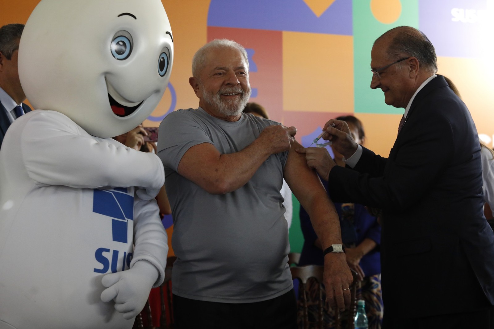 Lula é vacinado pelo vice-presidente,Geraldo Alckmin,com a primeira vacina bivalente de COVID no ato de lançamento da Mobilização Nacional pela Vacinação — Foto: Cristiano Mariz