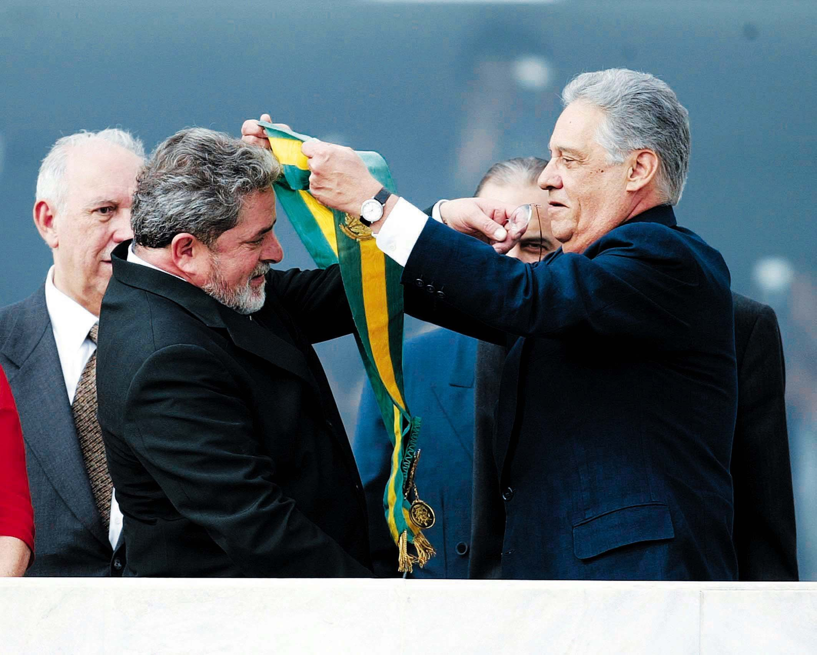 O presidente eleito Luiz Inácio Lula da Silva recebe de Fernando Henrique Cardoso a faixa de Presidente da República no Parlatório do Palácio do Planalto — Foto: Ivo Gonzalez / Agência O Globo