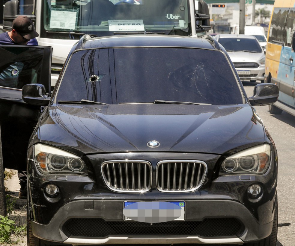 A BMW blindada apreendida tem uma seteira no para-brisa dianteiro — Foto: Gabriel de Paiva/Agência o Globo