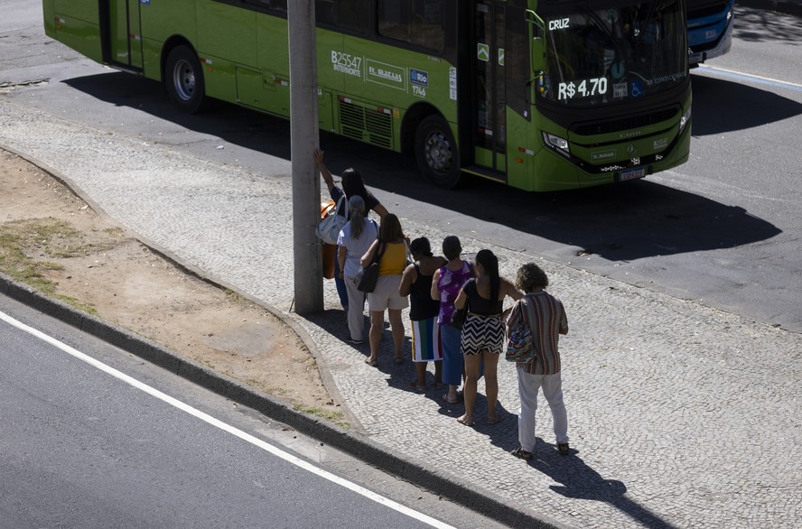 Passageiros procuram se proteger do sol quente na sombra de um poste em ponto de ônibus da Avenida Presidente Vargas,na Cidade Nova — Foto: Márcia Foletto/Agência O Globo