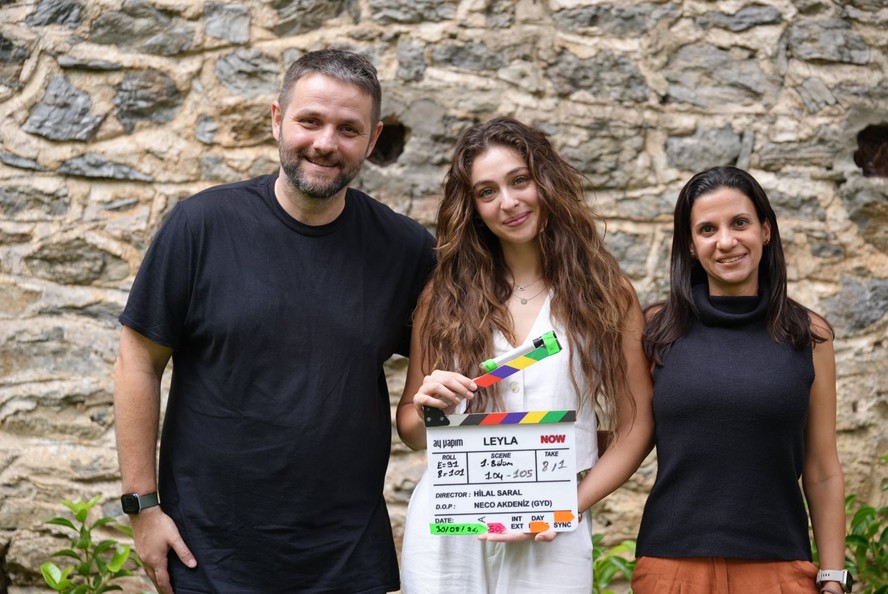 Lucas Zardo,produtor executivo de Dramaturgia da Globo,e Angela Colla,head de Negócios Internacionais e Coproduções,com a atriz Cemre Baysel (ao centro) — Foto: Divulgação