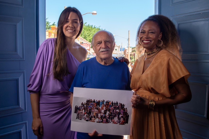 A narradora Renata Silveira com os atores Ary Fontoura e Edvana Carvalho durante a gravação da vinheta de fim de ano da Globo,numa das cidades cenográficas. Ele,que em 1971 participou da primeira mensagem veiculada pela emissora,pôde rever uma foto daquela ocasião. A campanha de 2024,“Vários Brasis,muita Globo,uma só festa”,estreará neste domingo (1),num intervalo do “Fantástico”.