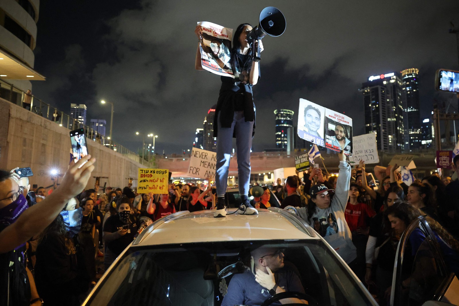 Manifestantes carregam cartazes em frente ao Ministério da Defesa durante uma reunião de parentes de reféns israelenses mantidos em Gaza desde os ataques de 7 de outubro por militantes do Hamas,na cidade costeira israelense de Tel Aviv,em 30 de março — Foto: JACK GUEZ / AFP