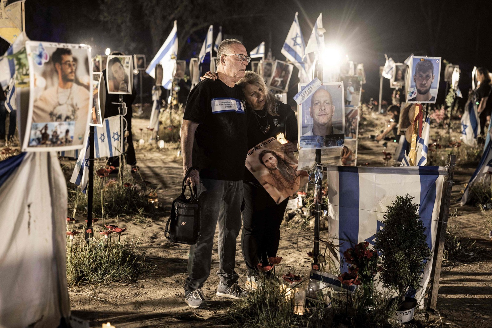 Parentes e amigos choram junto ao túmulo do soldado israelense Eitan Itzhak Oster morto em combates na região da fronteira norte com o Líbano,durante seu funeral no Cemitério Militar Monte Herzl,em Jerusalém,em 2 de outubro — Foto: Ahmad GHARABLI / AFP
