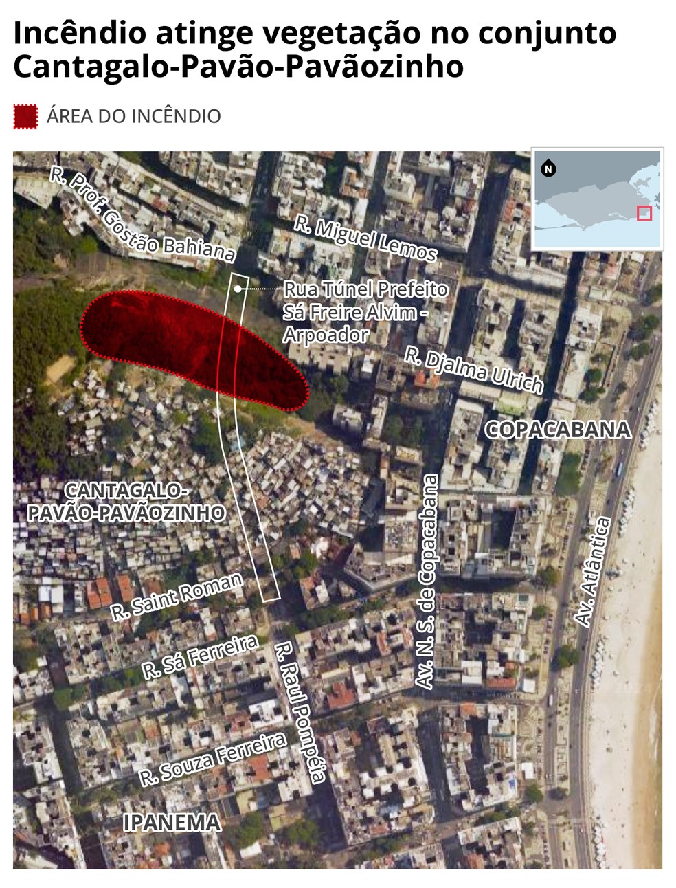 O Corpo de Bombeiros conseguiu controlar os quatro focos de incêndio,após cinco horas de combate às chamas. O fogo atingiu uma área de mata no alto do Pavão-Pavãozinho e também no Cantagalo,na Zona Sul do Rio. Por ser uma área de difícil acesso,as equipes tiveram dificuldades para debelar o fogo. Uma escada Magirus teve que ser usada para auxiliar o trabalho dos bombeiros. Da Avenida Atlântica dava para ver a fumaça na encosta.