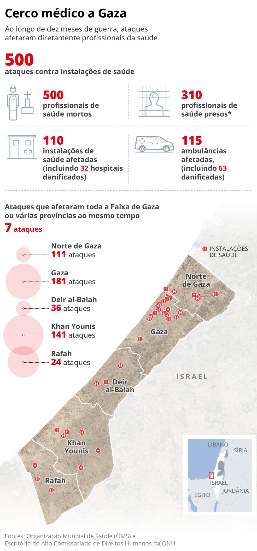 Ataques frequentes a Gaza criaram cerco médico no território palestino — Foto: Arte/O GLOBO