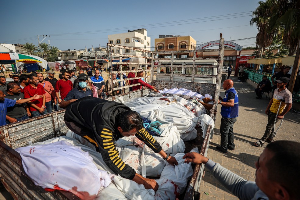 Caminhão contendo os corpos de palestinos mortos por ataques aéreos israelenses no centro de Gaza durante as primeiras semanas do conflito,em 22 de outubro de 2023 — Foto: Samar Abu Elouf/The New York Times