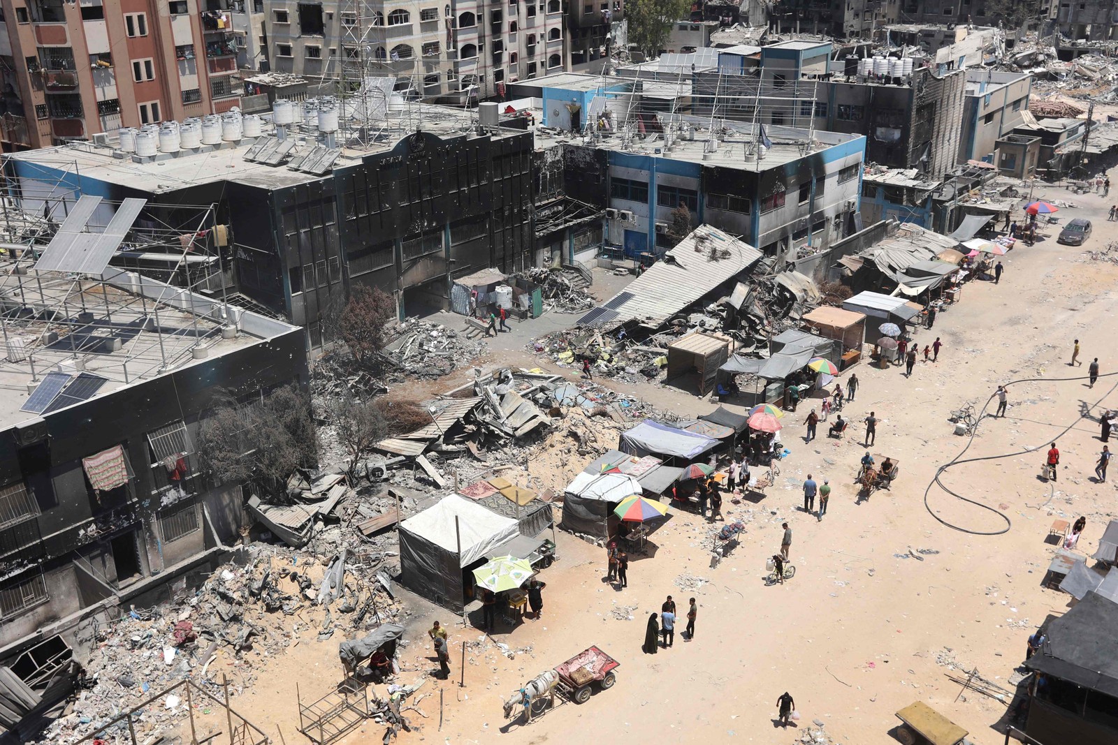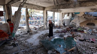 Escola administrada pela Agência de Assistência e Obras da ONU para os Refugiados da Palestina (UNRWA),que foi atingida por bombardeios israelenses,no campo de Nuseirat,no centro da Faixa de Gaza — Foto: Eyad BABA / AFP