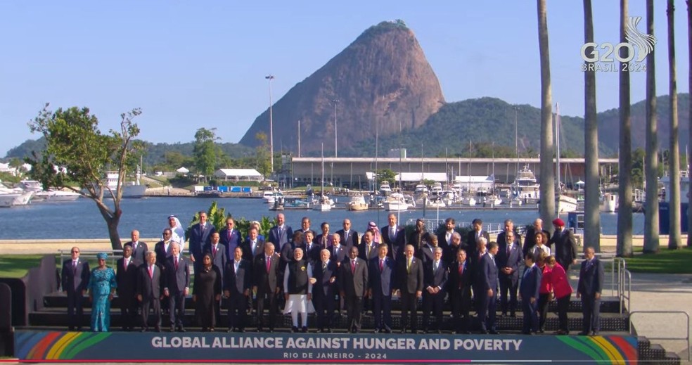 Foto dos líderes com o Pão de Açúcar ao fundo foi símbolo da busca por consenso na reunião de chefes de Estado,no Rio. Reforma da arquitetura financeira para o clima foi um dos pontos debatidos no encontro — Foto: Divulgação