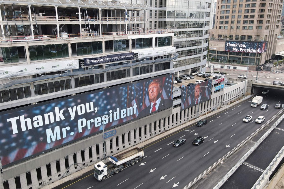 Outdoor com um retrato do presidente dos EUA,e mensagem de agradecimento é exibido em fachada de um hotel em Tel Aviv — Foto: Jack Guez/AFP