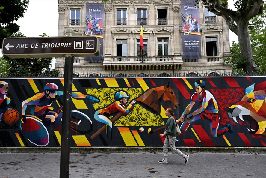Pedestre caminha diante de mural que homenageia Jogos Olímpicos,em Paris — Foto: Punit PARANJPE / AFP