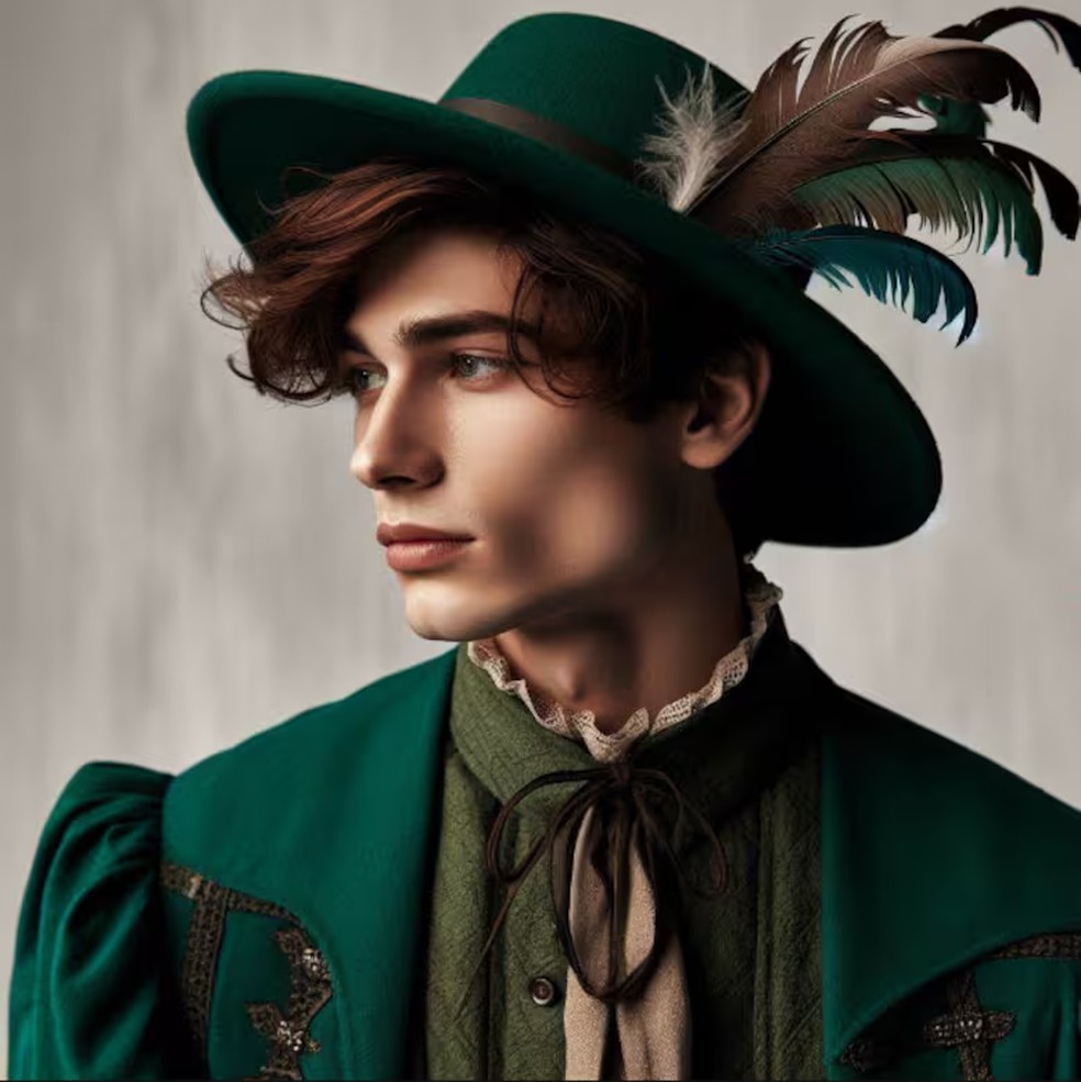 O jovem,vestido quase inteiramente de verde,usa alguns acessórios de couro,entre eles suspensórios,luvas e botas de cor marrom. Na cabeça usa um pequeno chapéu com uma pluma de penas coloridas que caem e se misturam com as dos pássaros que voam ao seu redor.