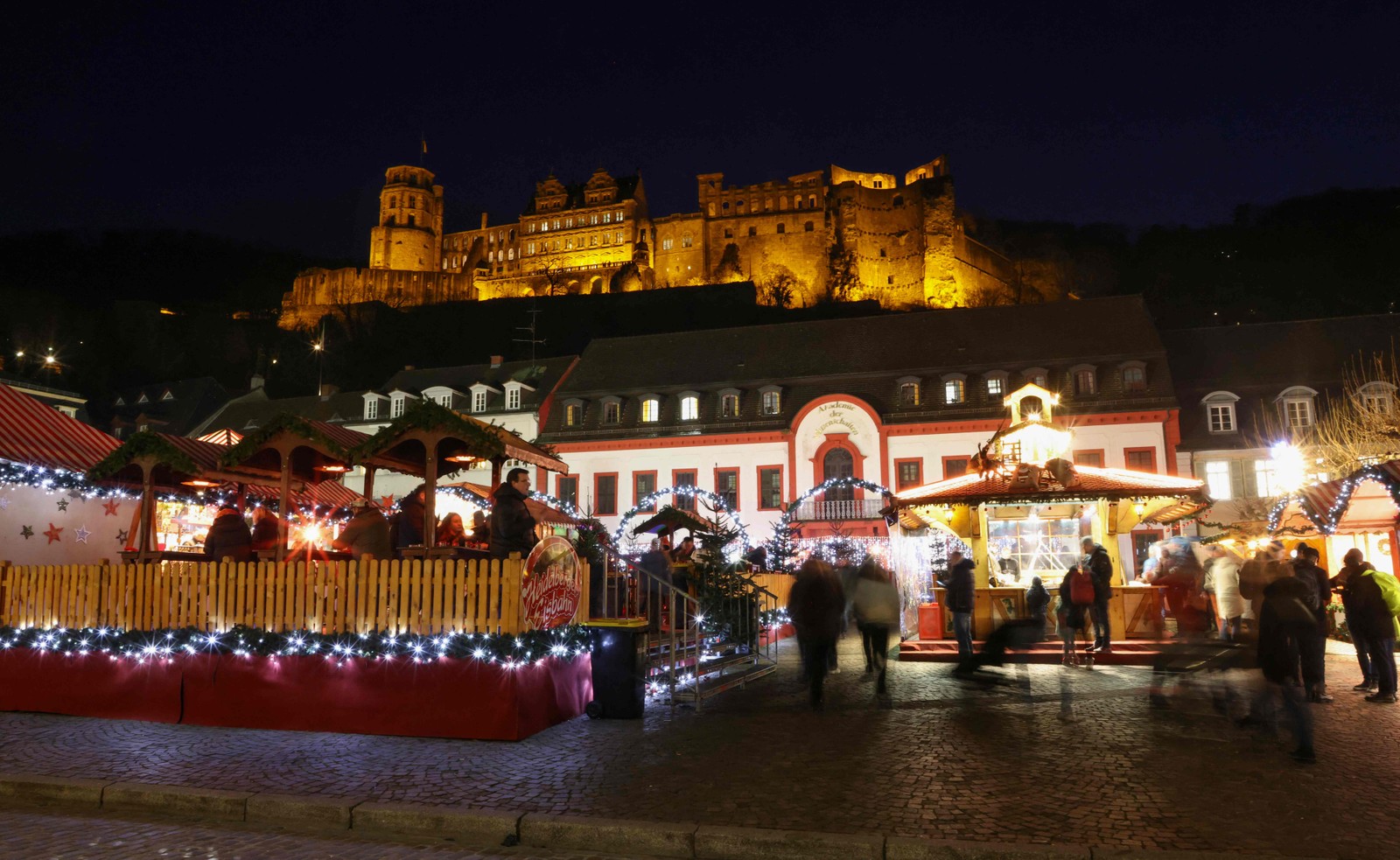 Pessoas visitam o mercado de Natal aos pés do Castelo de Heidelberg,na cidade de mesmo nome,na Alemanha — Foto: Daniel Roland/AFP