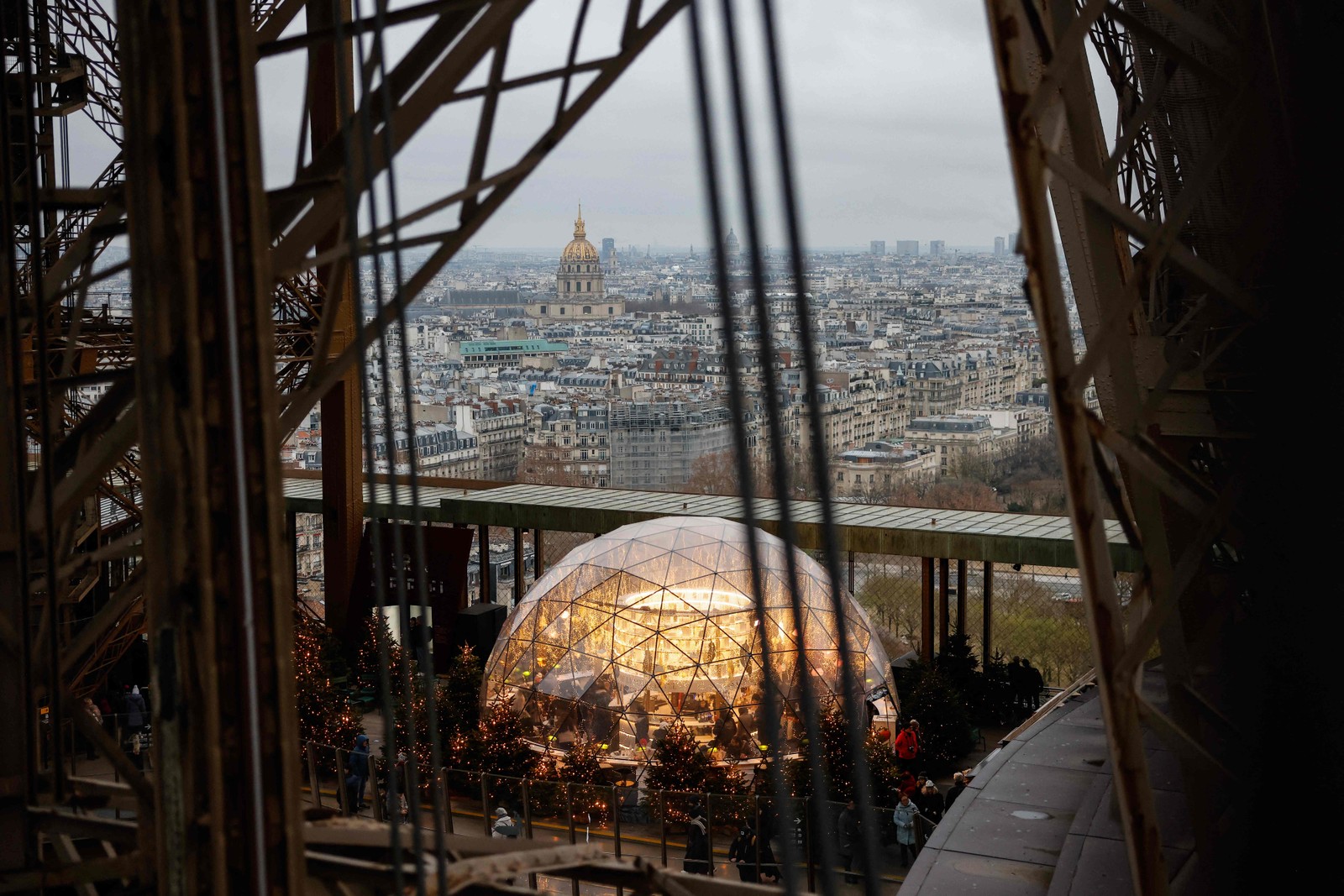 Uma esfera temporária,com decoração natalina,foi montada na base da Torre Eiffel,símbolo máximo de Paris,na França — Foto: Ian Langsdon/AFP
