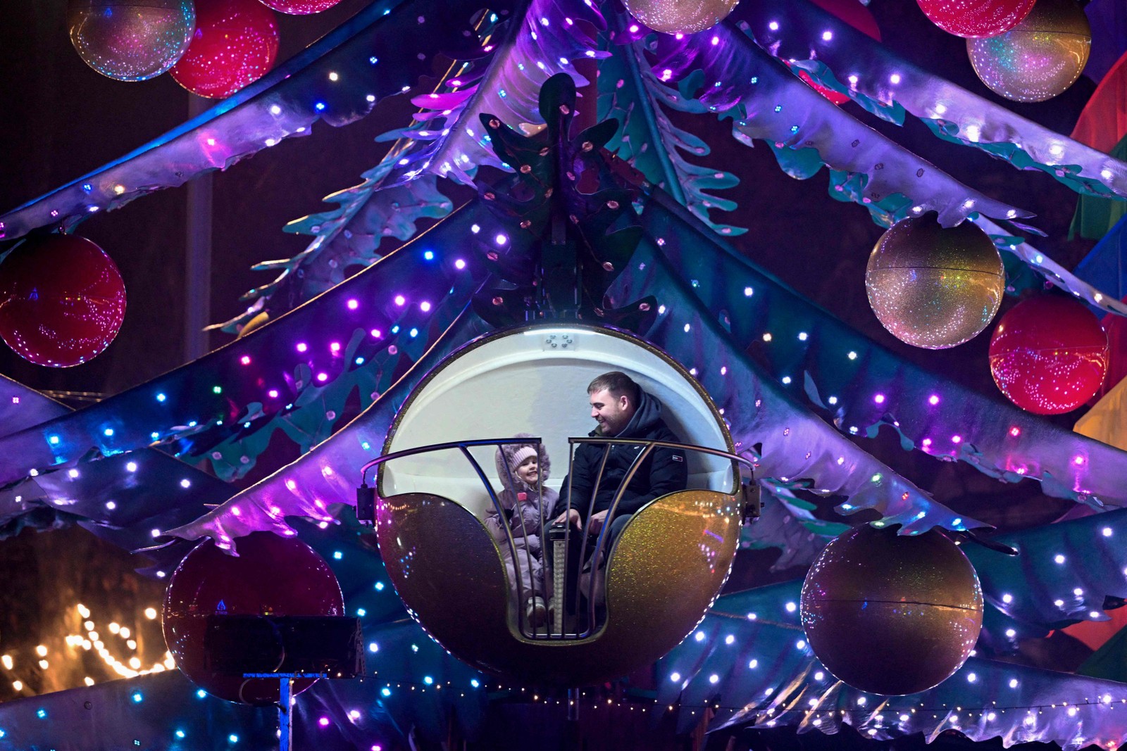 Um home e uma criança brincam num carrossel em forma de árvore de Natal montado em Kiev,na Ucrânia — Foto: Sergei Gapon/AFP